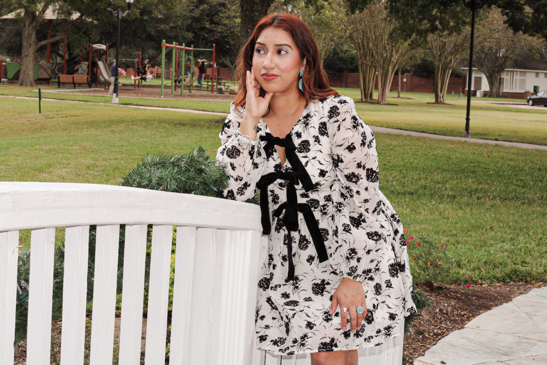 This flowy floral dress is the perfect mix of sweet and western chic. Designed with soft long sleeves, a flattering, relaxed fit, and bold velvet bows, it adds the perfect girly touch to your cowgirl style.