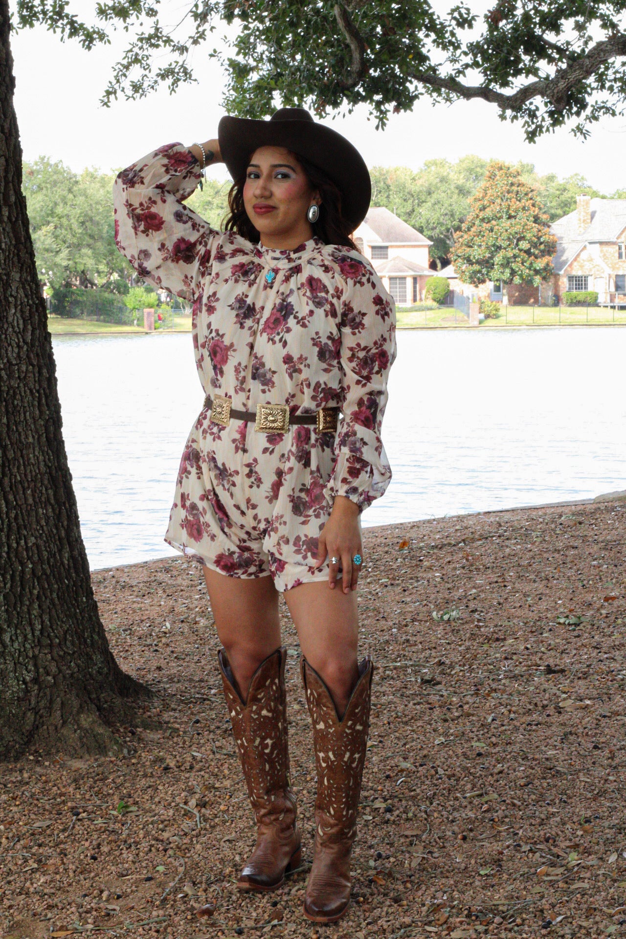This floral, flowy romper would be perfect for your next Ella Langley concert. Lightweight, comfy, and effortlessly western, it features soft long sleeves, a relaxed fit, and a gorgeous rose print that gives you that feminine cowgirl vibe. Style it with boots and a statement belt.